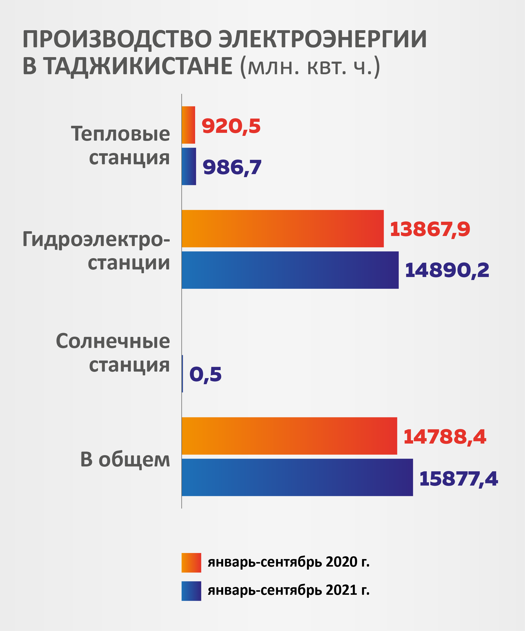 По официальным статистическим данным, в январе-сентябре нынешнего года в Таджикистане произведено около 15,9 млрд киловатт-часов электроэнергии, что на 7,4% больше, чем в соответствующем периоде 2020 года.