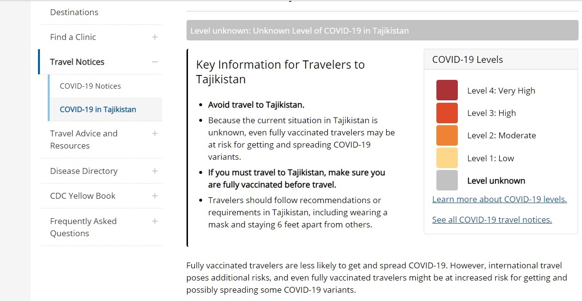Центр по контролю и профилактике заболеваний при Министерстве здравоохранения США включил Таджикистан в список стран, где риск заражения коронавирусом неизвестен.