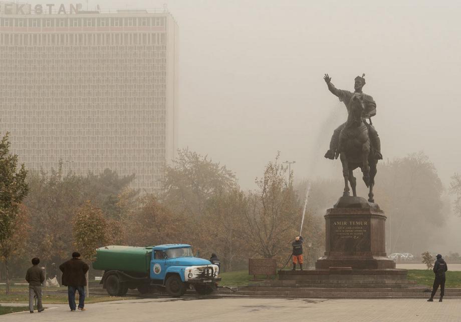 Власти узбекской столицы предпринимают меры для того, чтобы снизить количество пыли в воздухе — в центре города кроны деревьев и памятники поливают водой из шлангов.