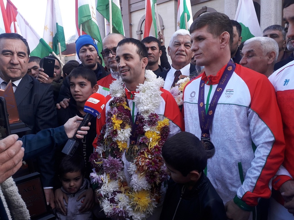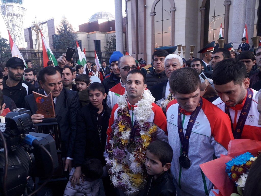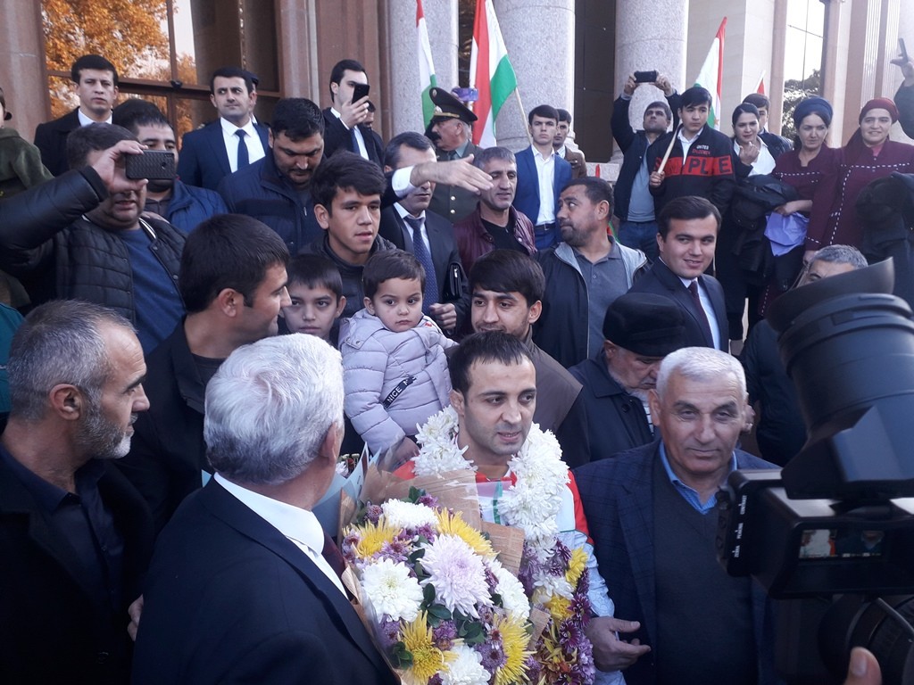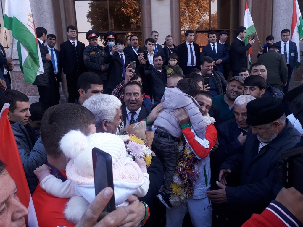 В Душанбе 15 ноября торжественно встретили таджикских самбистов, которые завоевали медали на чемпионате мира. Встречать спортсменов в аэропорт пришли руководители спорта, близкие и родственники героев, их друзья и болельщики, военный оркестр, музыканты, журналисты.