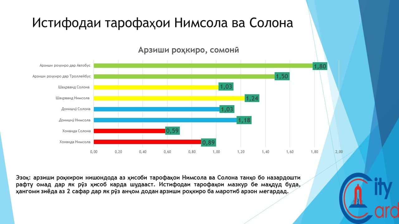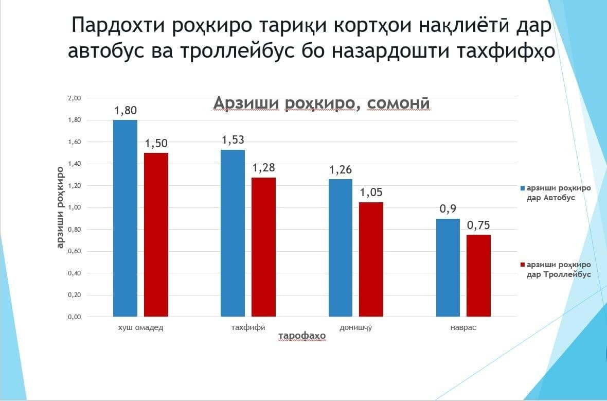 При пополнении баланса карты на сумму более 90 сомони гражданам предоставляется 15% скидки, стоимость проезда автобусом составляет 1,53 сомони, троллейбусом 1,28 сомони.