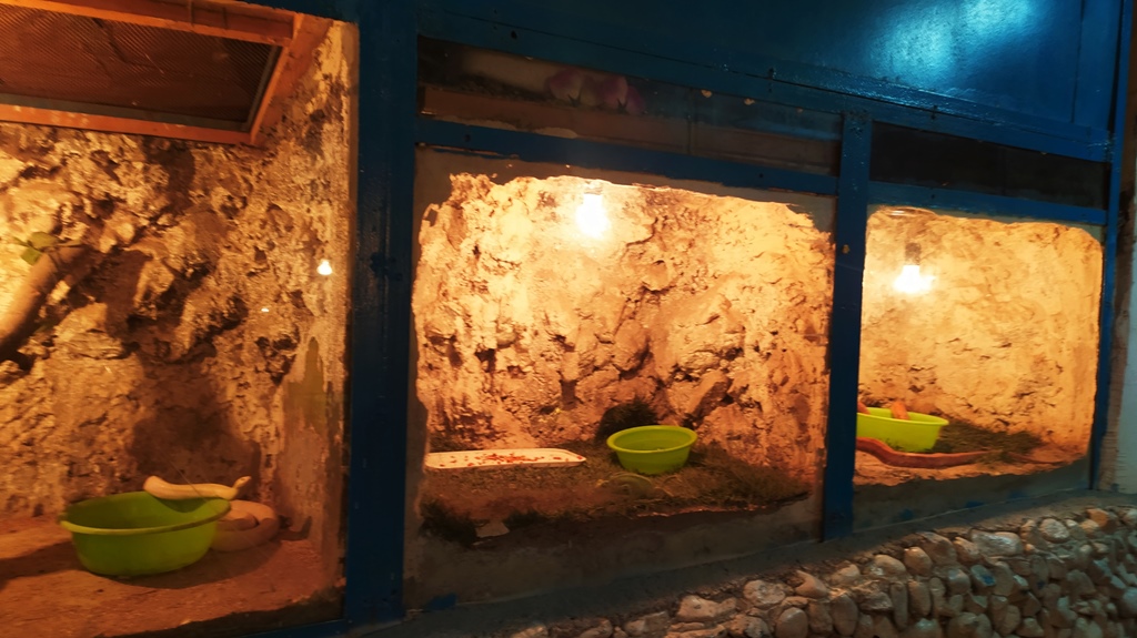 В каждом террариуме есть лампа накаливания для имитации солнечного тепла, а также животные получают облучение ультрафиолетовой лампой.