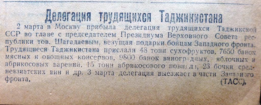 В период Московской битвы 1941-1942 гг. 20-я Таджикская Краснознаменная ордена Ленина горно-кавалерийская дивизия успешно громила части 78-ой немецкой пехотной дивизии, подразделения СС «Мертвая голова», «Великая Германия». Частями дивизии только за период с 17 ноября по 19 декабря в боях было захвачено и уничтожено более 40 танков, 600 автомашин, 60 орудий, снарядов и мин – 7 млн. 900 тыс., солдат и офицеров – 4 тыс.