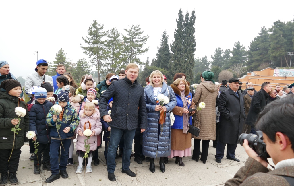 Присутствующие почтили память павших защитников Москвы минутой молчания и возложили венки и цветы к мемориальному захоронению воинов умершим от ран полученным на фронтах ВОВ в эвакогоспиталях Душанбе.