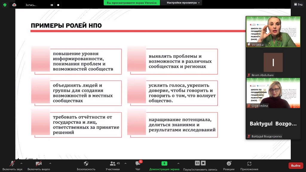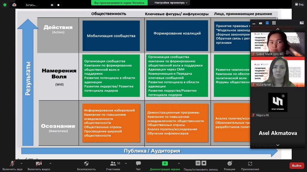 «И я решила участвовать, чтобы набраться знаний в области гендерных прав, видения проблем в этой сфере, чтобы в будущем раскрывать данную тематику используя грамотные доводы и имея признанную во всем мире научную базу знаний», — добавила Зульфия.
