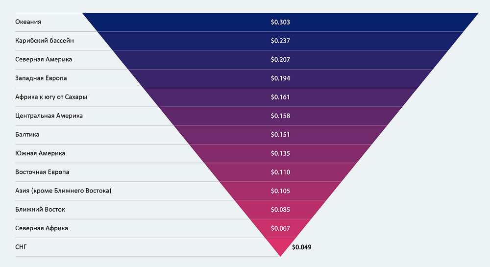 Среди стран СНГ наиболее низкие тарифы, как уже указали, в Кыргызстане ($0,017), и Таджикистане ($0,023). Далее идут: Узбекистан ($0,027), Казахстан ($0,039), Россия ($0,050), Азербайджан ($0,051), Украина ($0,057), Беларусь ($0,069), Армения ($0,072), Молдова ($0,085).
