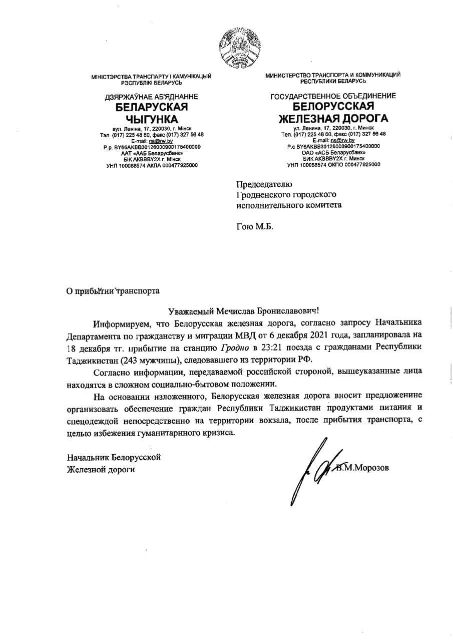 В частности, Морозов пишет, что «Белорусская Железная Дорога» запланировала на полночь 18 декабря прибытие поезда с 243 гражданами Таджикистана из России на станцию Гродно … согласно запросу Начальника Департамента по гражданству и миграции МВД от 6 декабря 2021 года.