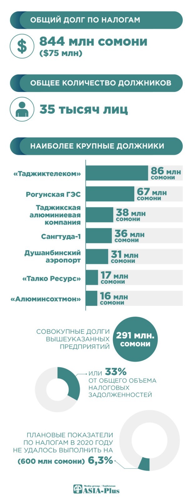 Между тем, в Таджикистане продолжается непопулярная практика списания налоговых обязательств правительственным предприятиям. На октябрь текущего года их задолженность стала меньше на $2,5 млрд, чем в начале года – списали.