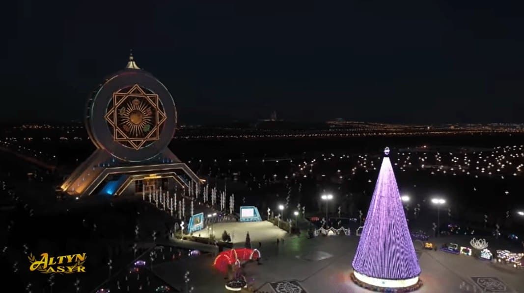 Зелёная красавица, увенчанная восьмилучёвой звездой и цифрами 2022, 15 декабря была установлена в центре сказочного городка, обустроенного в Ашхабаде на площади перед Культурно-развлекательным центром Älem, где ежегодно проходят новогодние торжества.
