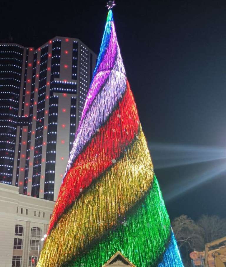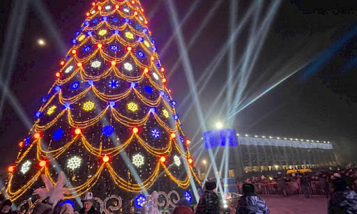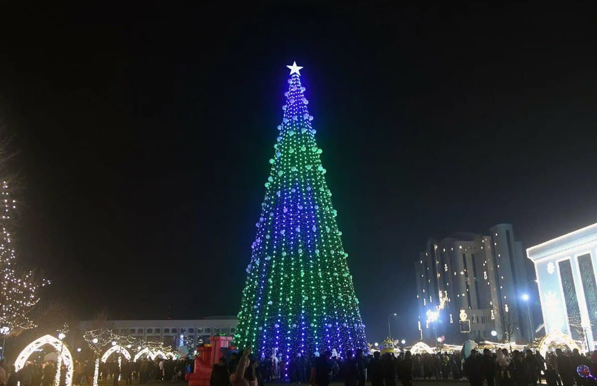 Главную новогоднюю ёлку Таджикистана на площади «Дусти» в столице в этом году зажгли 9 декабря. На ели в этом году не много игрушек. Но зато она просто огромная — 30 метров в высоту и 16,5 метров в диаметре.