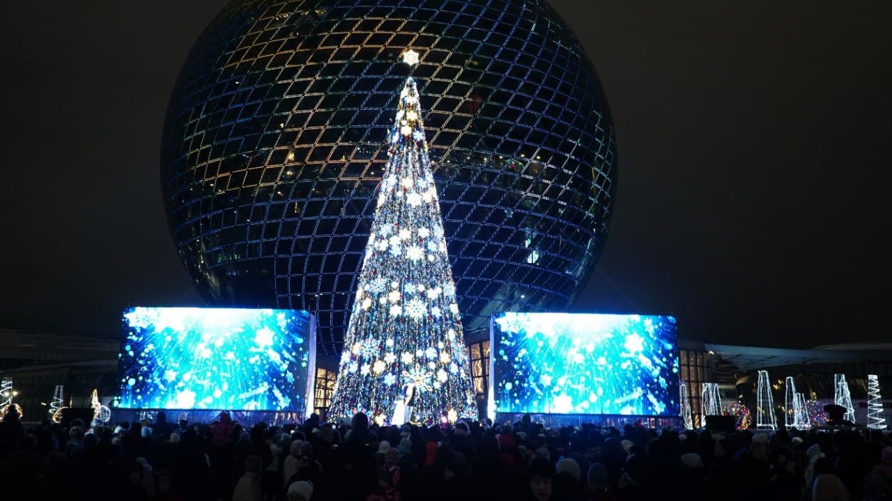 В столице Казахстана на площади перед сферой «Нур Алем» 19 декабря прошла церемония зажжения главной новогодней елки страны. На 25-метровой красавице зажглись более 1600 новогодних шаров, почти 300 больших и малых снежинок. Новогодняя елка в диаметре достигает 10 метров. Вес главного символа Нового года в Казахстане составляет 4048 кг.