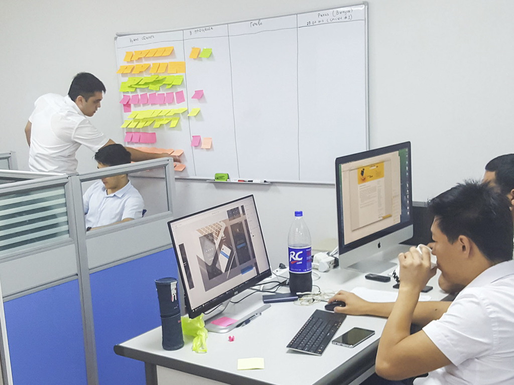 В нашем департаменте трудятся более 35-ти сотрудников. Они поделены на Скрам-команды (от английского Scrum – схватка). В каждой команде работает от 7 до 10 человек, состоящие из таких специалистов как разработчики, дизайнеры, тестировщики и продакт-оунеры. Прямая коммуникация между ними сама по себе ускоряет работу и у них есть все необходимые условия, чтобы осуществить полный цикл разработки продуктов – от идеи до запуска в эксплуатацию.