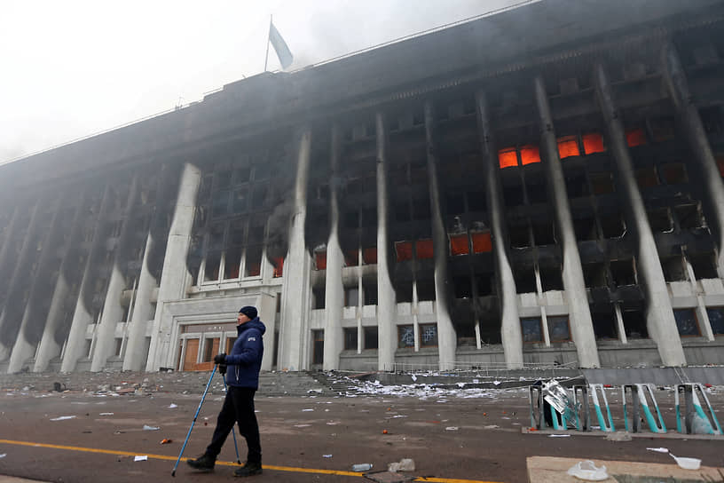 С утра 7 января пальба слышалась со стороны площади Республики, что перед зданием акимата (местная администрация). Площадь была эпицентром протеста. Акимат сначала захватили, а потом сожгли. Прежде белое здание теперь черное от копоти.