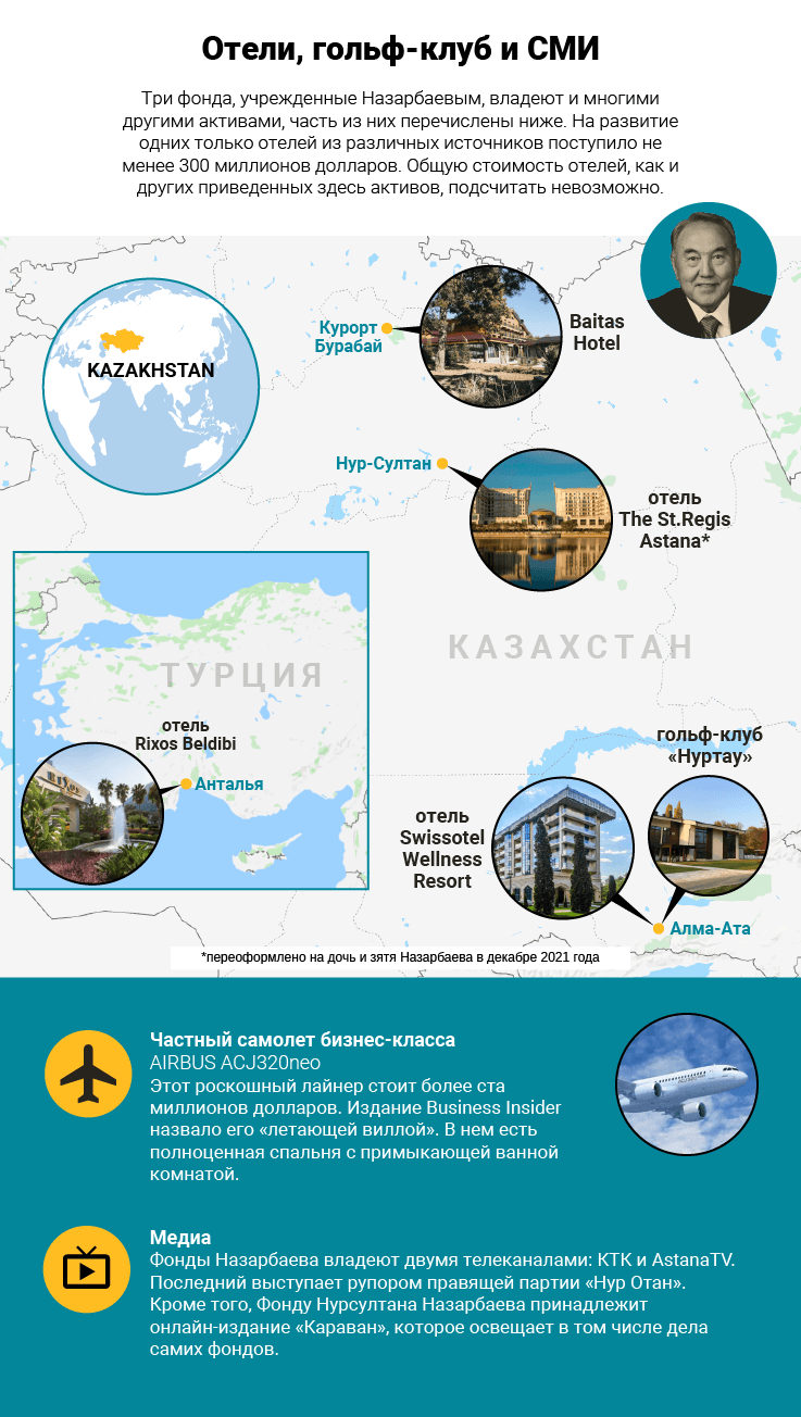 Бывший президент Казахстана, молчавший во время январских протестов, распоряжается активами на миллиарды долларов через сеть фондов, которые отчитываются только перед ним. Среди имущества: банки, отели, телеканалы и самолет за 100 миллионов долларов — говорится в совместном расследовании OCCRP, Kloop и «Vласть».