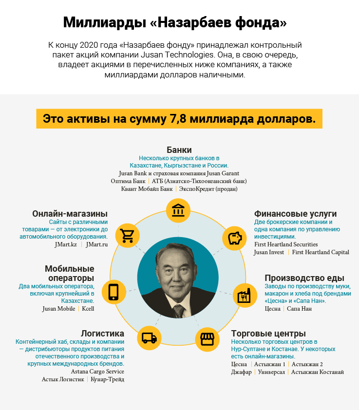 Он контролирует эти активы не самым распространенным способом: через четыре частных благотворительных фонда, которые Назарбаев основал будучи президентом. Заявленная цель фондов — помогать народу Казахстана. На самом же деле организации, которые занимаются популяризаций казахского языка и раздают детям подарки, тайно владеют долями в десятках компаний.