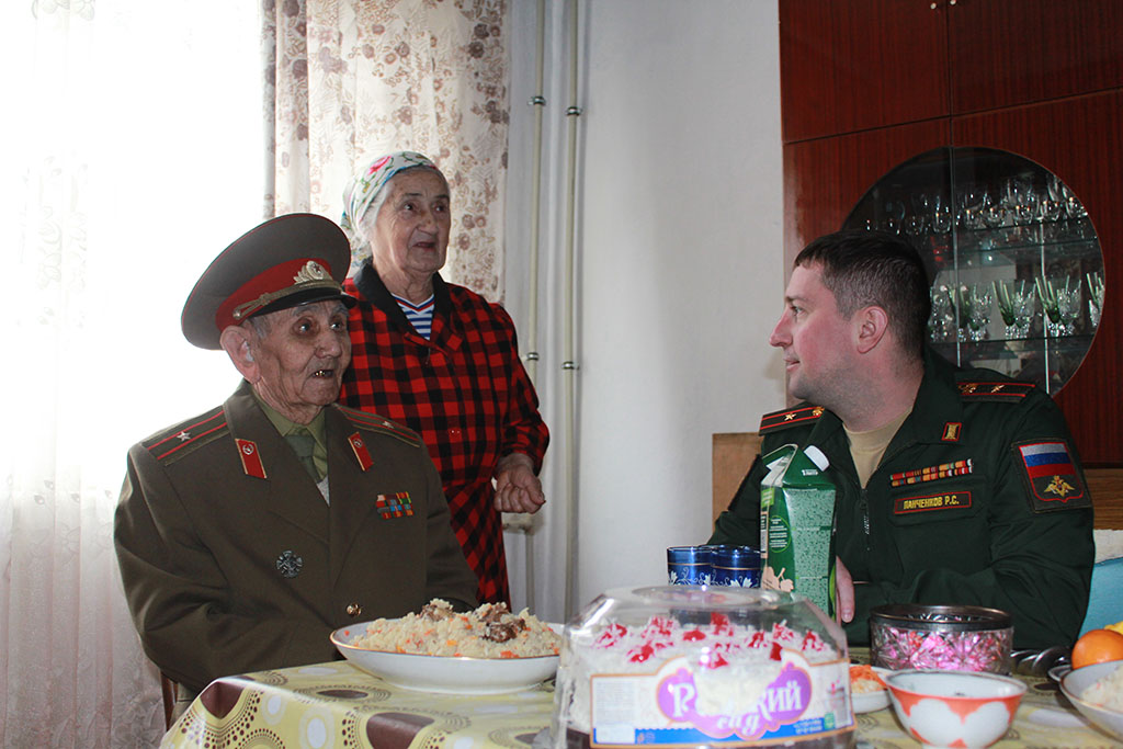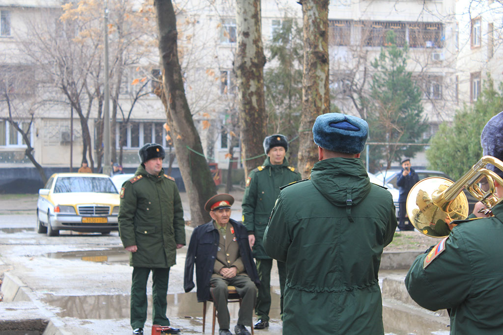 Военнослужащие инженерно-саперного подразделения российской военной базы в Таджикистане накануне 321-й годовщины со дня образования инженерных войск торжественно поздравили с профессиональным праздником ветерана 201-й мотострелковой дивизии майора в отставке Ташбулата Хасанова, проживающего в Душанбе.