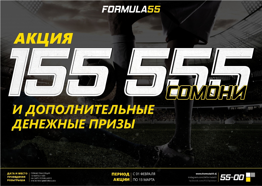 Компания «Formula55» запустила на своём сайте суперакцию с общим призовым фондом в 155 555 сомони, а также дополнительными денежными призами.