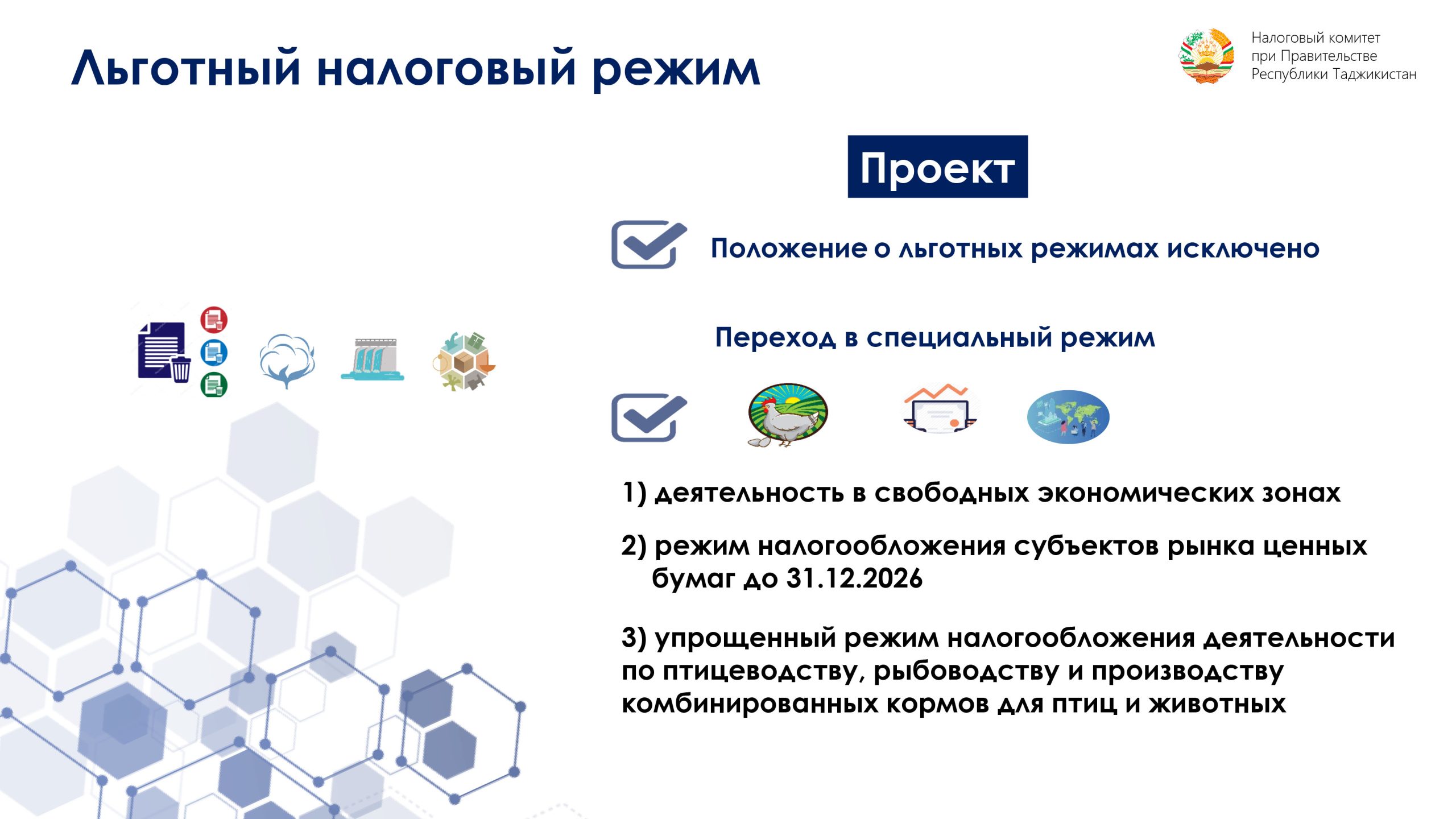 В новой редакции Налогового кодекса остаются предусмотренные ранее льготы и введены новые смягчения. В частности, количество налогов сокращено с 10 до 7, НДС сокращен с 18% до 15%, налог на гостиничные услуги сокращен с 18% до 7%, а налог на реализацию отечественной сельхозпродукции и ее переработки сокращен с 18% до 5%.
