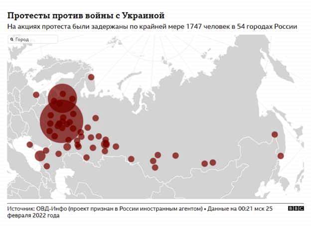 • Протесты против войны прошли как минимум в 54 городах России, на них были задержаны более 1,7 тыс человек.