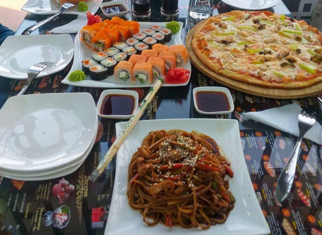 Меню сети кафе японской кухни порадует вас воком с курицей и морепродуктами за 39 сомони, раменом за 35 сомони и другими блюдами.