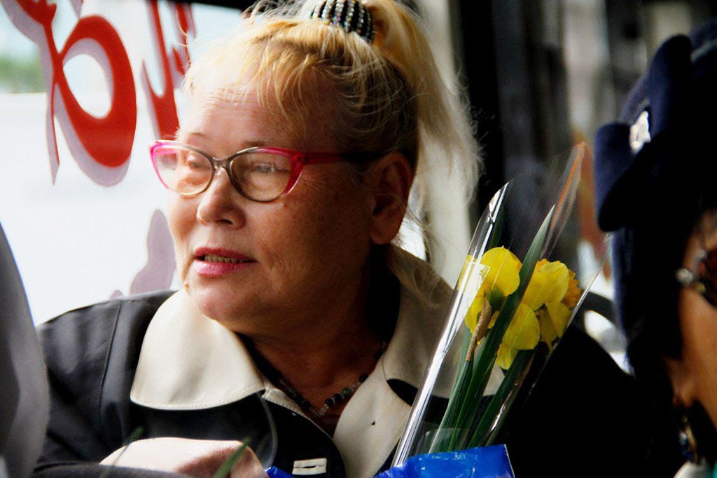 А еще в этом году женщин поздравляет таджикский певец Чоршанбе Аловатов, он исполняет песни для пассажирок нашего автобуса.
