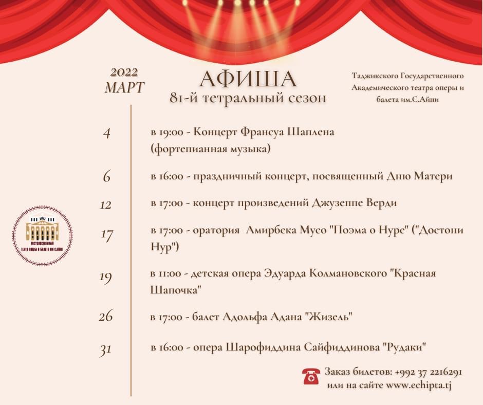 Афиша 81 театрального сезона Таджикского государственного театра оперы и балета имени Айни на март обещает интересные концерты, оперы, оратории и балет. Не упустите!