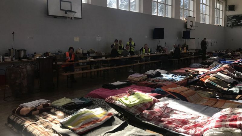 Палаточный городок у границы не рассчитан на долгое пребывание — в нем нет условий для того, чтобы поспать и помыться, нет туалетов. Однако в шести километрах от границы располагается центр помощи беженцам — большой спортивный зал, где установлены кровати и есть условия для отдыха. Он быстро заполняется, но в 25 километрах есть еще один центр.