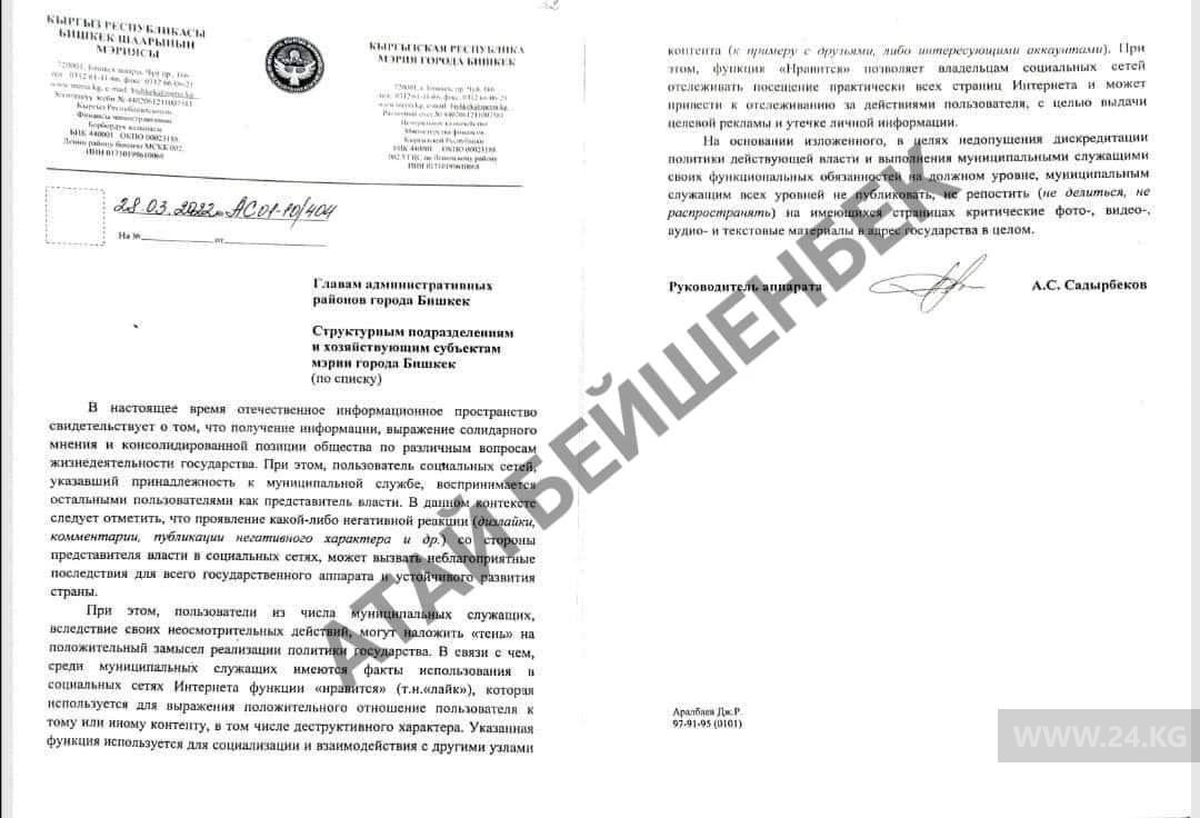 Сотрудникам мэрии Бишкека запретили реагировать, делиться публикациями и комментировать их в соцсетях. Такое распоряжение было подписано руководителем аппарата муниципалитета, сообщает 24.kg.