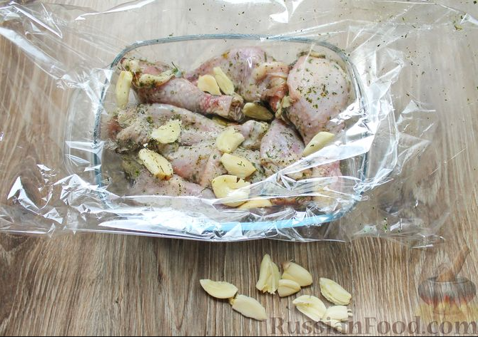 Запечённые в рукаве с ревенем и чесноком куриные ножки