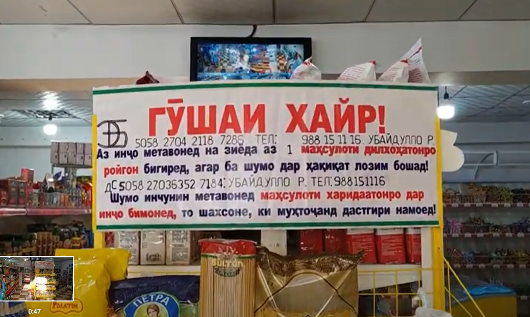 В Кулябе предприниматель Абдурахмон Азизов в своем магазине открыл «Уголок милосердия», куда складывает продукты первой необходимости для того, чтобы бедные и нуждающиеся люди могли бесплатно брать их себе.
