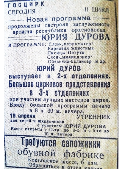 Так, в первый год Великой Отечественной войны здесь несколько месяцев находился в эвакуации знаменитый цирк Юрия Дурова, который успел поставить несколько новых цирковых программ.