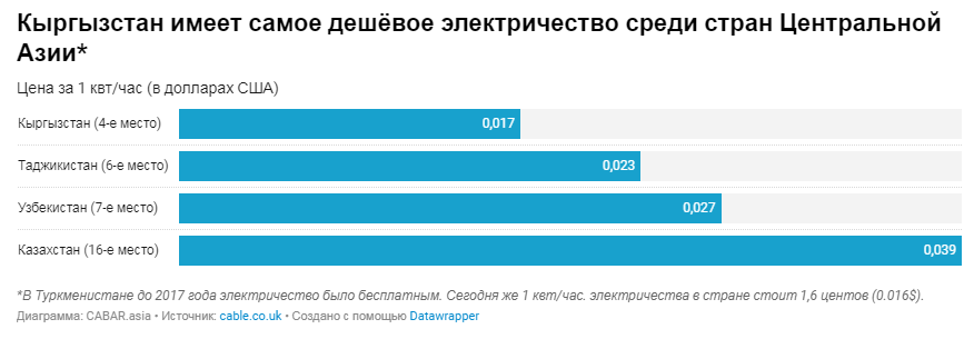 Таким образом, тарифы на электроэнергию в Таджикистане (а также в Кыргызстане) должны быть в разы меньше по сравнению с Казахстаном, Узбекистаном и Туркменистаном.
