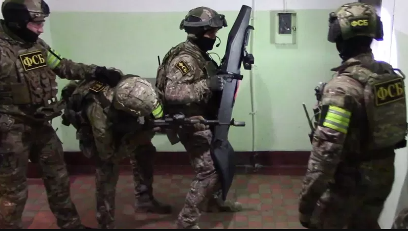 Далее ФСБ опубликовало видео вторжения бойцов в квартиры (один из хозяев очень быстро открыл дверь). Людям, чьи лица размыты, заламывали руки, чтобы они не сопротивлялись.