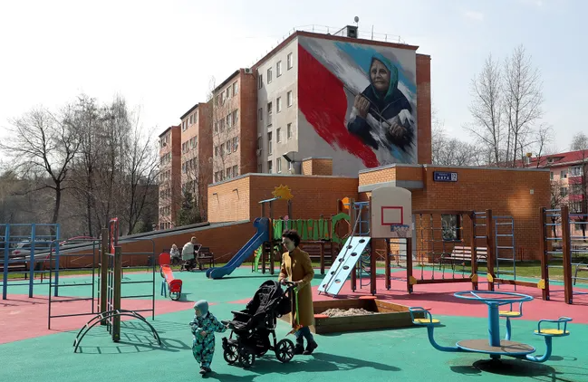 Реутов, Московская область. На стене одного из домов нарисовано граффити российского художника Ильи Демченко. На граффити изображена героиня видеоролика, появившегося в апреле. На видео женщина с красным советским флагом в руках вышла к украинским военным, приняв их за россиян.
