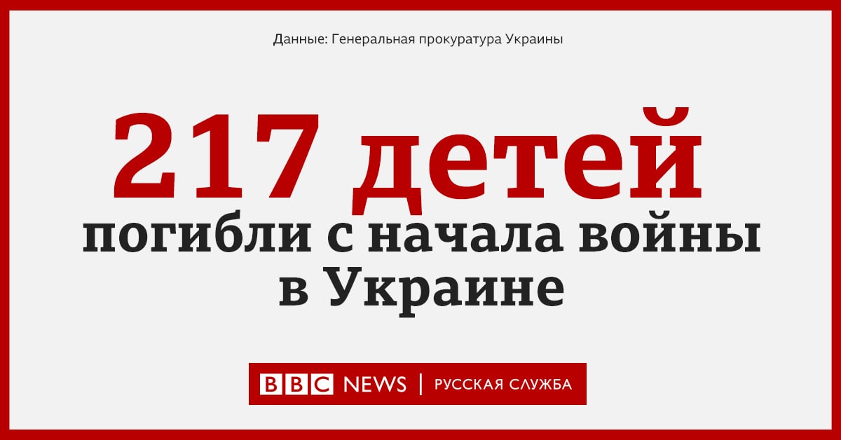 С начала войны в Украине погибли 217 детей, сообщает Генеральная прокуратура Украины. 391 ребенок получил ранения. Больше всего детей пострадали в Донецкой, Киевской и Харьковской областях.