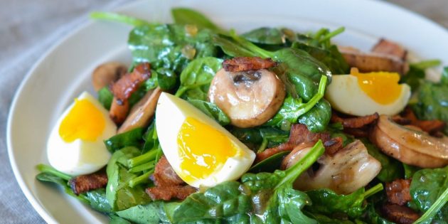 Далее у шпината удаляют стебли. На тарелку выкладывают зелень, грибы, перец и яйца, их солят и заправляют оливковым маслом.