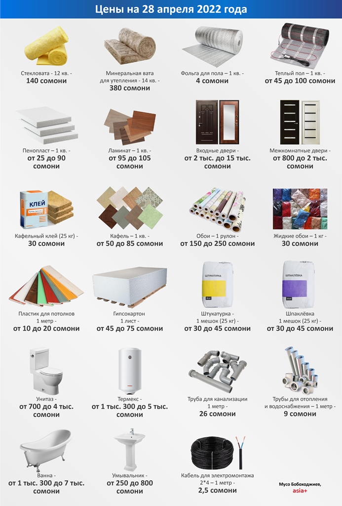Корреспондент «Азия-Плюс» сходил на рынок стройматериалов «Кушониён» и зафиксировал цены на необходимые материалы на сегодняшний день.