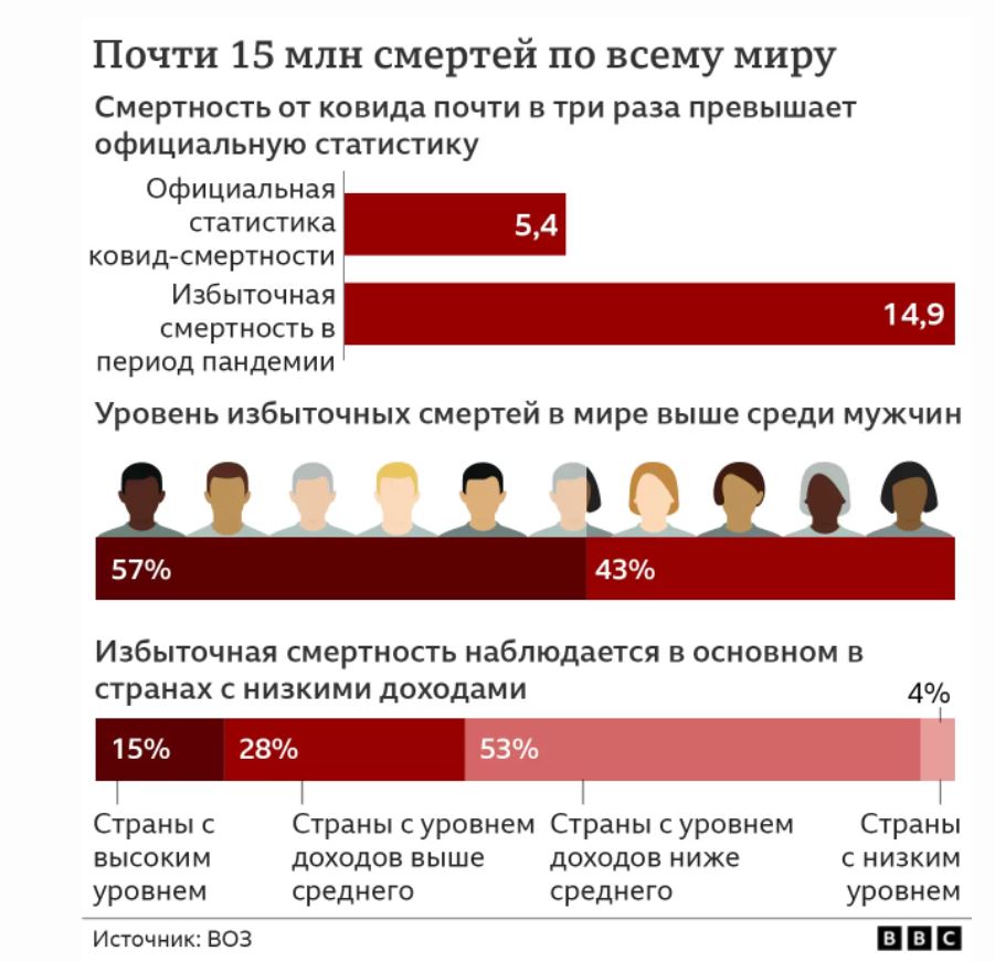Показатель в 15 млн смертей от ковида на 13% превышает средний показатель смертности в мире от любых причин за два года.