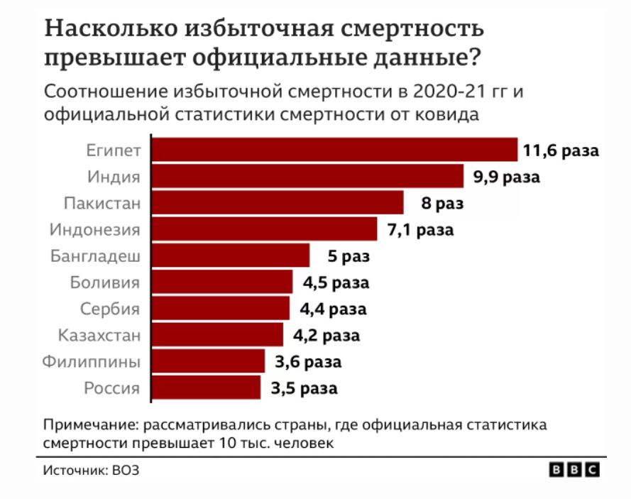 К примеру, в Индии, утверждает ВОЗ, умерло 4,7 млн — в десять раз больше официальных данных, предоставленных властями. На эту страну приходится почти треть всех смертей от ковида в мире. В России официальные данные в три с половиной раза ниже реальных.