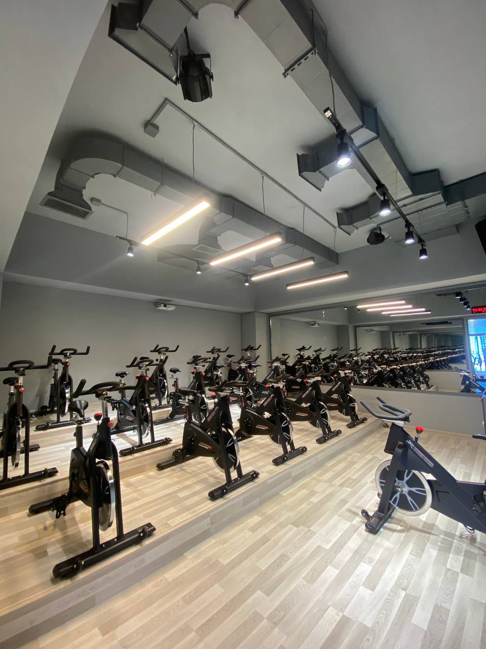 В «55 GYM Ladies» женщина занимается на велосипедных тренажерах – сайклинге.