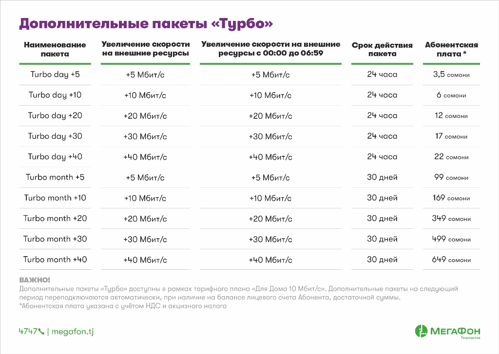 Скорость, давшая название этому тарифу, гарантирована для доступа на внешние ресурсы, то есть находящиеся вне доменной зоны tj. «Ночная» скорость (с 00:00 до 06:59) ещё выше – до 20 Мбит/с. А на локальных таджикских ресурсах можно «летать» на скорости до 100 Мбит/с.