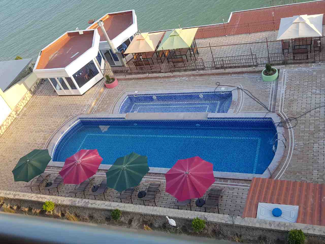На берегу моря, который относится к территории комплекса, стоят беседки и топчаны, где можно полежать и насладиться видом на море.