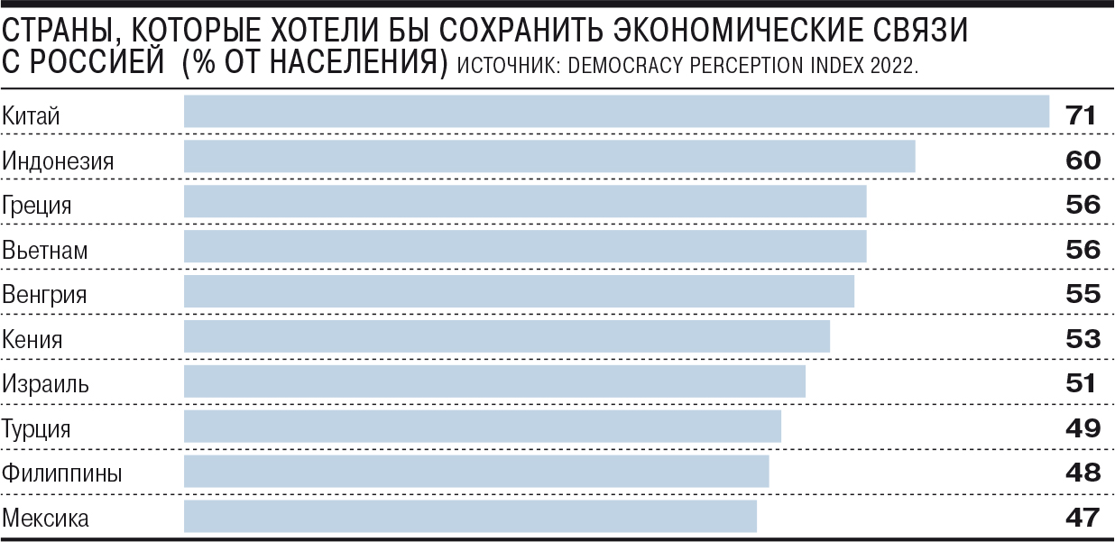 Так, в Греции к России лишь 22% относятся позитивно, а 45% — негативно. При этом сохранить торговлю с РФ хотят 56% греков. Схожая картина в Венгрии: симпатизируют России лишь 16% респондентов, в то время как 48% воспринимают ее скорее негативно. В то же время 55% венгров за экономическое сотрудничество с Россией. Такой же тренд — «имидж России преимущественно плохой, но торговле это не должно мешать» — выявлен в Израиле, Турции, Кении, Нигерии, ЮАР, Мексике, Перу, Таиланде и на Филиппинах.