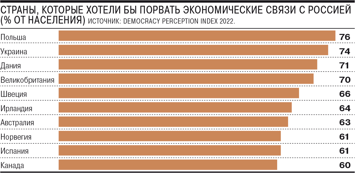 Участников опроса также спросили, готовы ли они на фоне военной кампании на Украине разорвать экономические связи с Россией. В 31 стране из 52 (жителям РФ этот вопрос не задавали) большинство респондентов ответили: «Да, готовы».