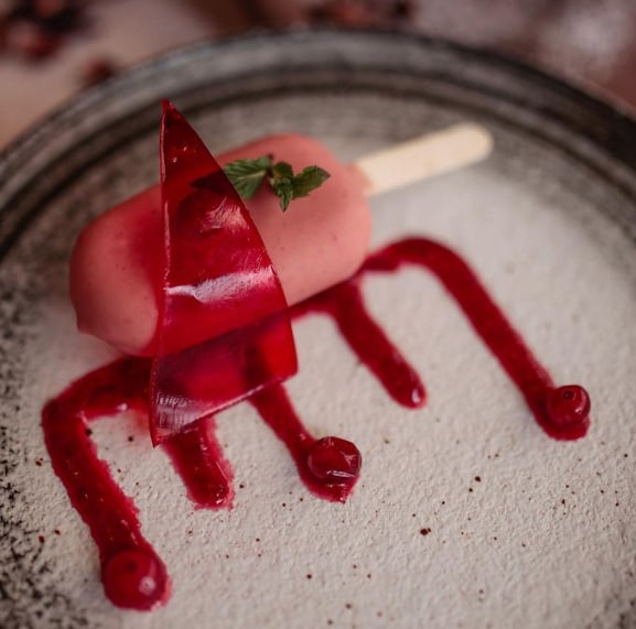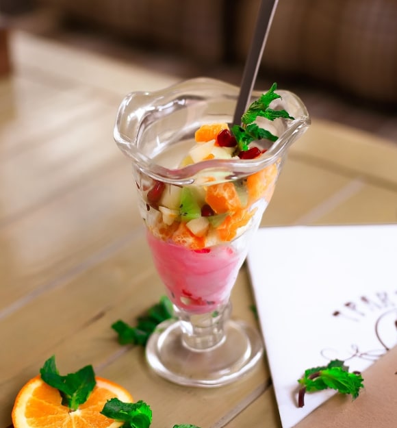 В меню есть пломбир, ванильный, шоколадный, клубничный, малиновый вкусы. Помимо этого мороженое украшается веточкой мяты или свежими ягодами.