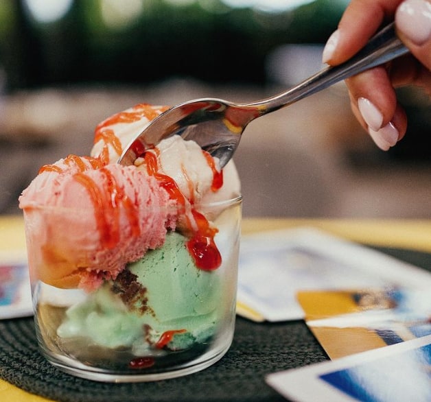 В кафе предоставляется большое разнообразие вкусов: ванильное, шоколадное, клубничное, малиновое, фисташковое, солёная карамель и прочие. Стоит отметить, что всё виды мороженого авторские.