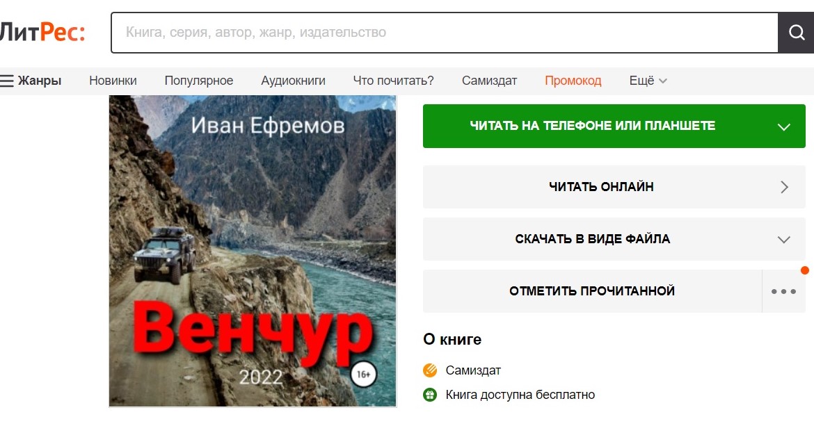 Сервисы электронных и аудиокниг «ЛитРес», «Ридеро» и «Литмаркет» опубликовали приключенческий роман Ивана Ефремова "Венчур" с подзаголовком "Риск ради добычи", который начинается с реального события.