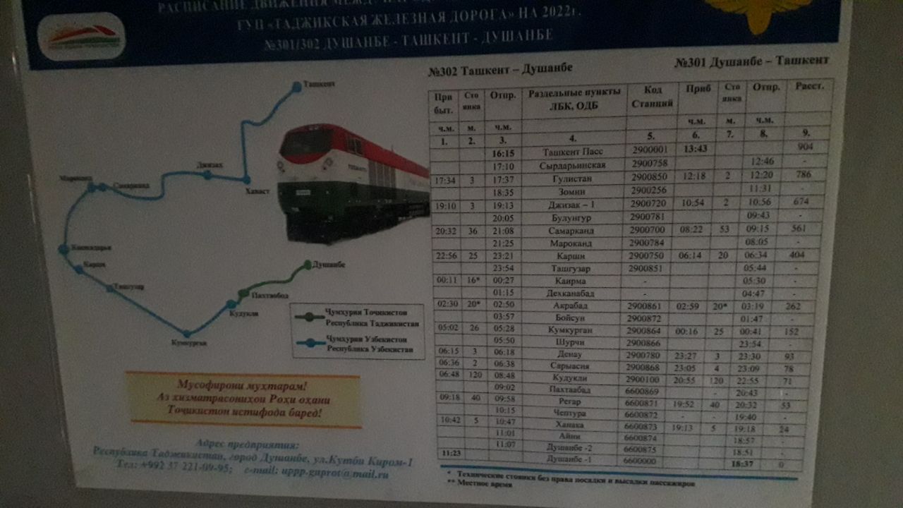 Напомним, что поезд будет отправляться еженедельно из Душанбе по понедельникам в 18:30 и прибывать в Ташкент по вторникам в 13:43.