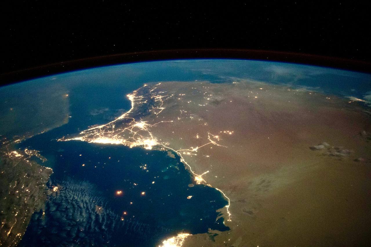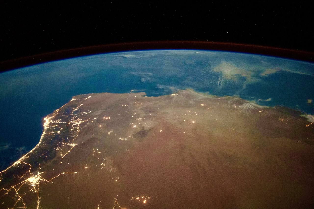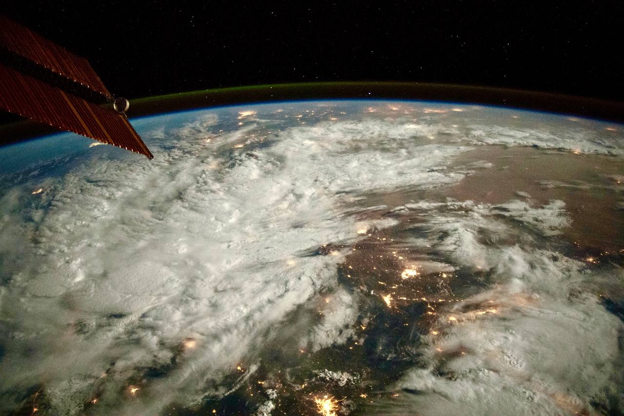 На снимках видны россыпи огней больших городов, бескрайние морские просторы и плотные белые облака. Четко просматривается тонкий слой атмосферы.