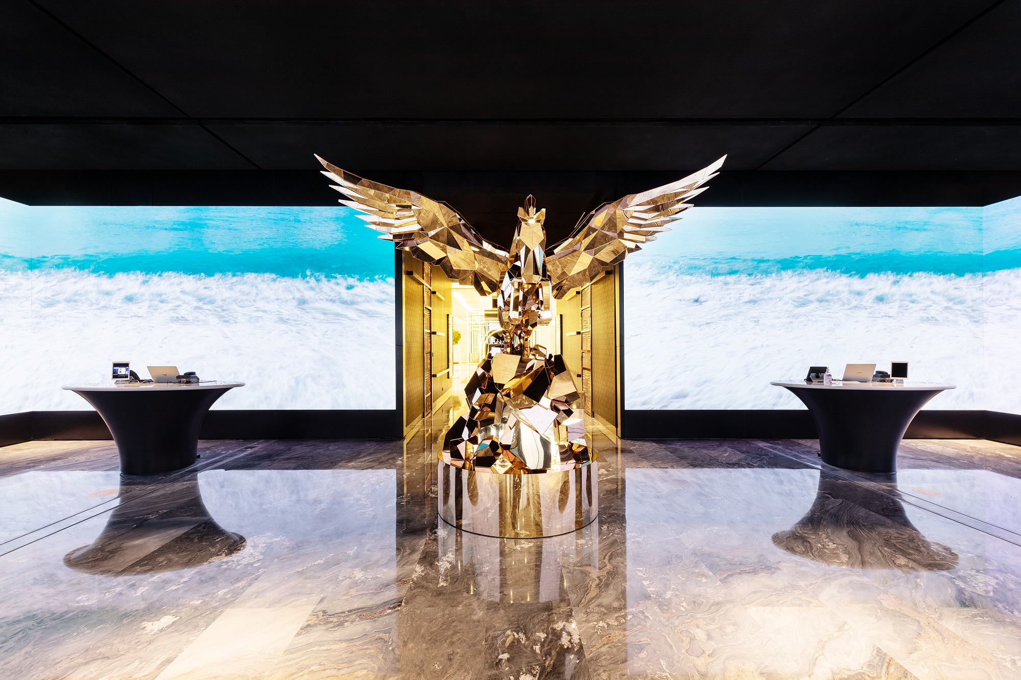 Этот проект передает разнообразные природные особенности Дубая, такие как температура, звуки города, ветер, песок и океан, а также завораживающую анимацию воды и пустыни.